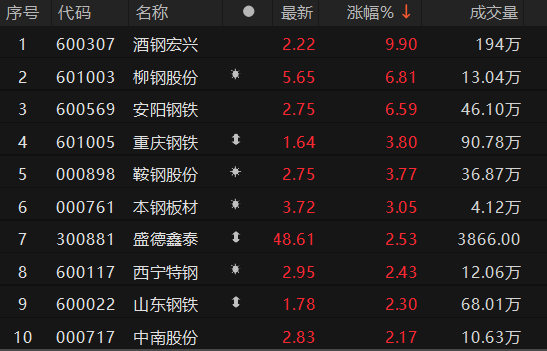上证报中国证券网讯 3月13日,钢铁板块快速拉升,截至9时38分,酒钢宏兴涨停,柳钢股份、安阳钢铁、重庆钢铁等跟涨。