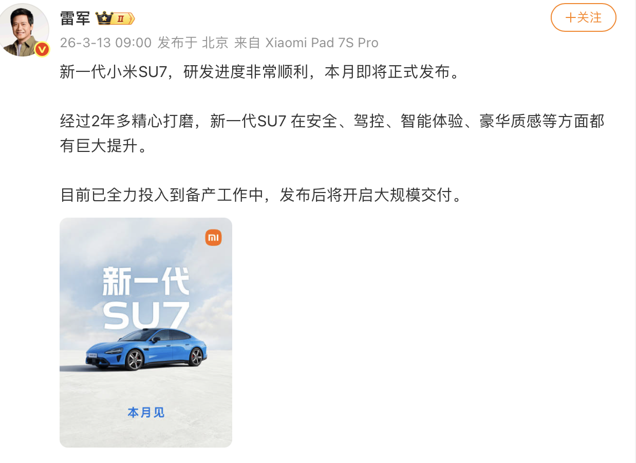 3月13日早间,小米创始人雷军在社交平台发文称,新一代小米SU7将于本月正式发布。目前已全力投入到备产工作中,发布后将开启大规模交付。