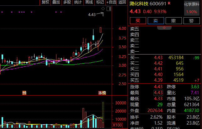 化工板块反复活跃,潞化科技(600691)2连板,超45万手买单封板,金正大、兴化股份、恒天海龙涨停,川金诺、金牛化工、金瑞矿业、四川美丰涨幅靠前。