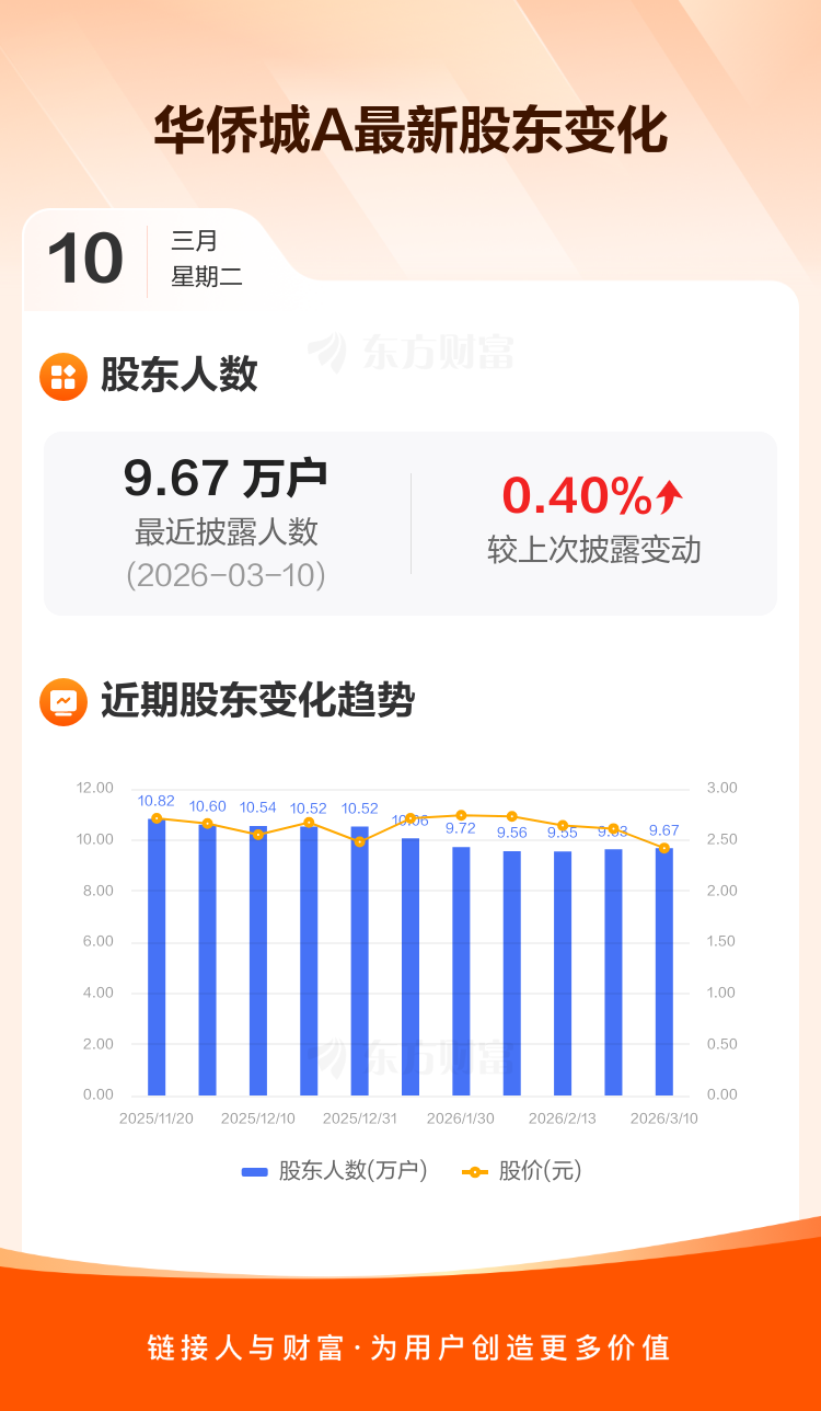 华侨城A最新披露数据显示,截至3月10日公司股东户数为9.67万户,较上期(2026年2月27日)增加386户,增幅为0.40%。户均持有流通股数量由上期的7.17万股下降至7.14万股,户均持股金额由上期的18.70万元减少至17.27万元。