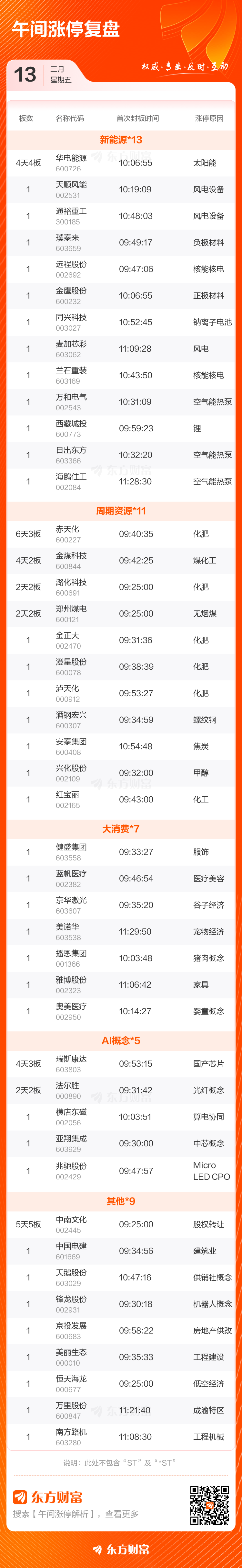3月13日午间涨停复盘:53股涨停 华电能源4天4板