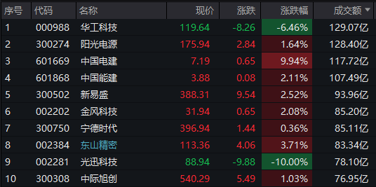 个股方面,华工科技成交额超129亿元居首,阳光电源、中国电建、中国能建成交额靠前。