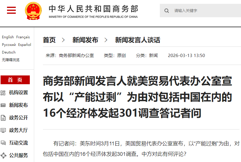 3月13日,商务部新闻发言人就美贸易代表办公室宣布以“产能过剩”为由对包括中国在内的16个经济体发起301调查答记者问。