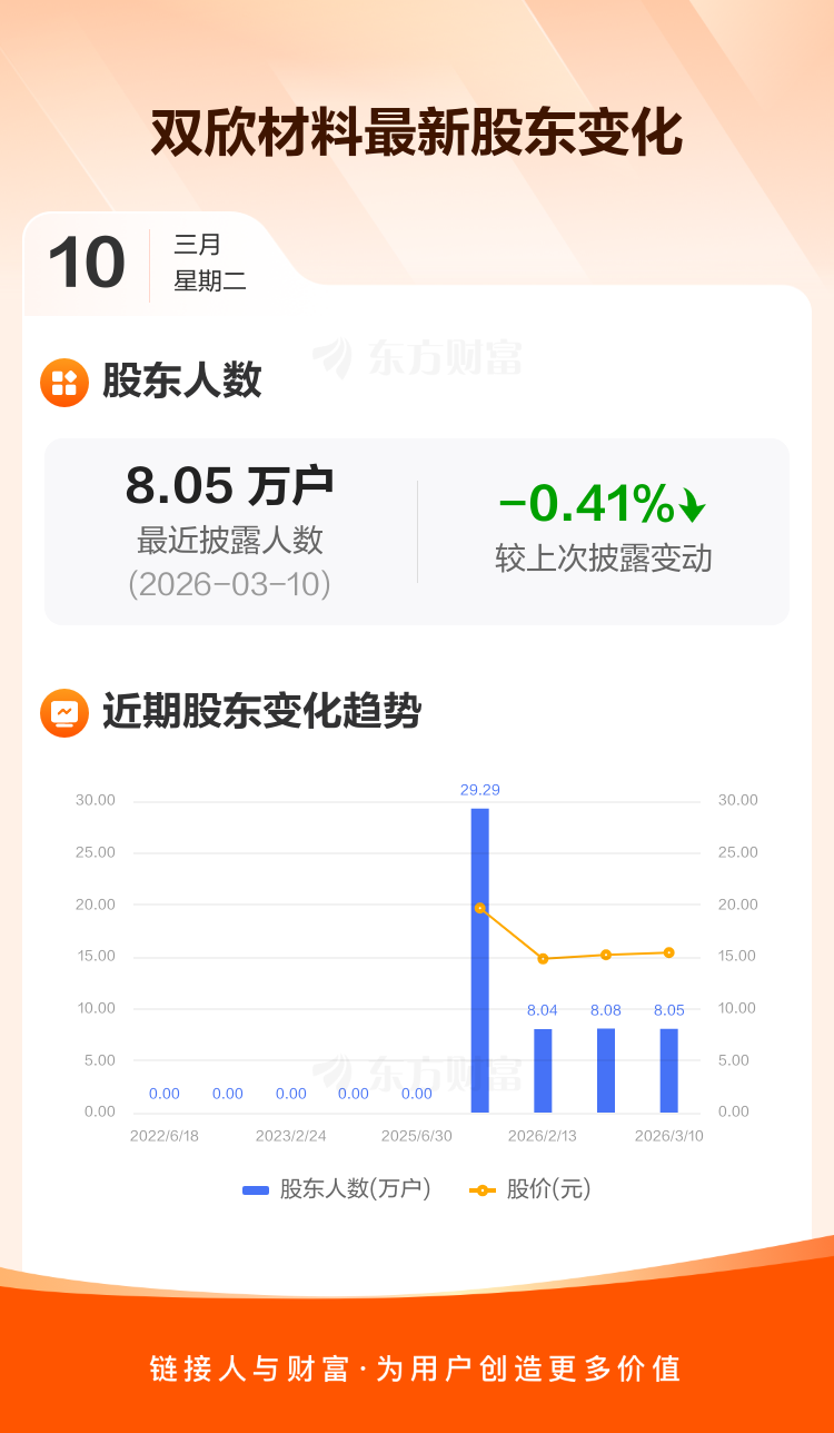 双欣材料最新披露数据显示,截至3月10日公司股东户数为8.05万户,较上期(2026年2月27日)减少334户,降幅为0.41%。户均持有流通股数量由上期的2486股上升至2496股,户均持股金额由上期的3.78万元增加至3.85万元。