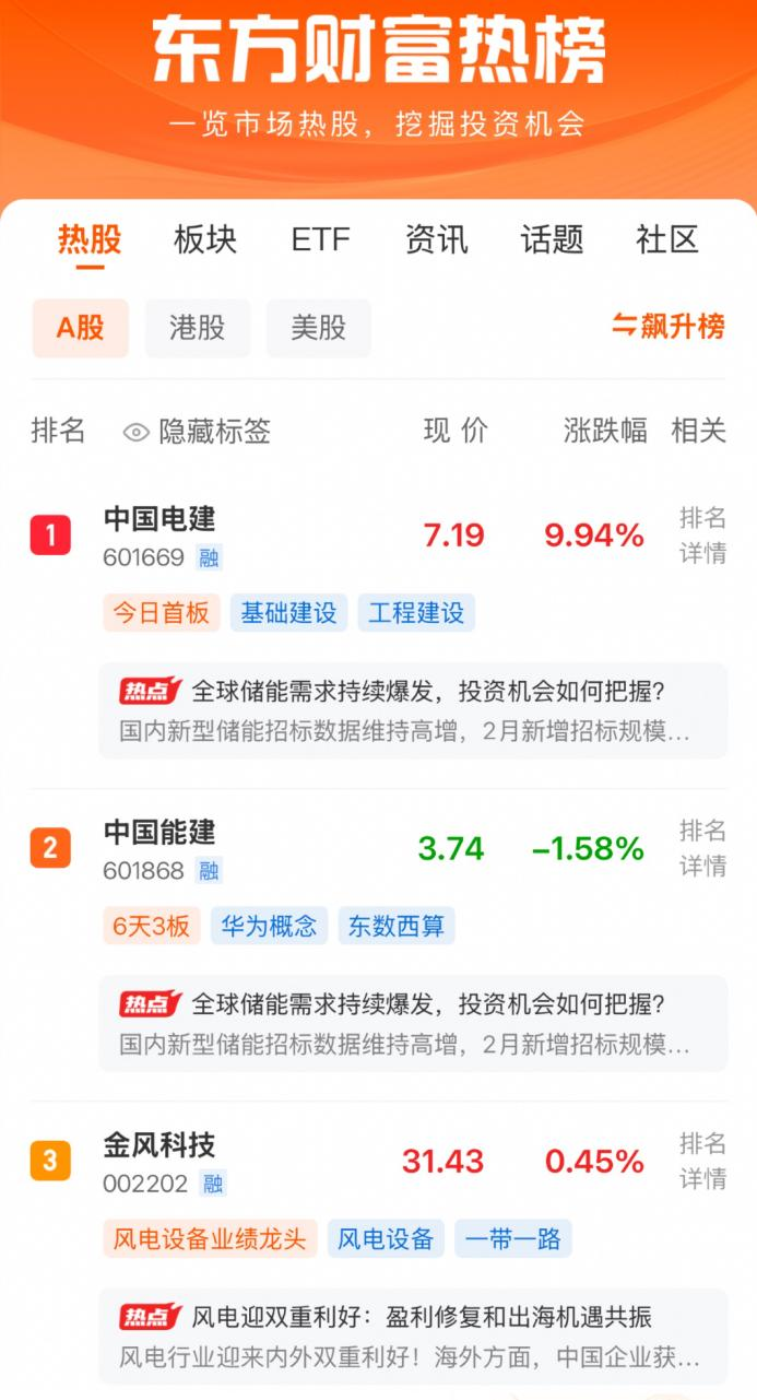 3月13日,两市震荡调整,三大指数均小幅收跌。东方财富热榜前三的股票中,中国电建位列第1,中国能建位列第2,金风科技位列第3。