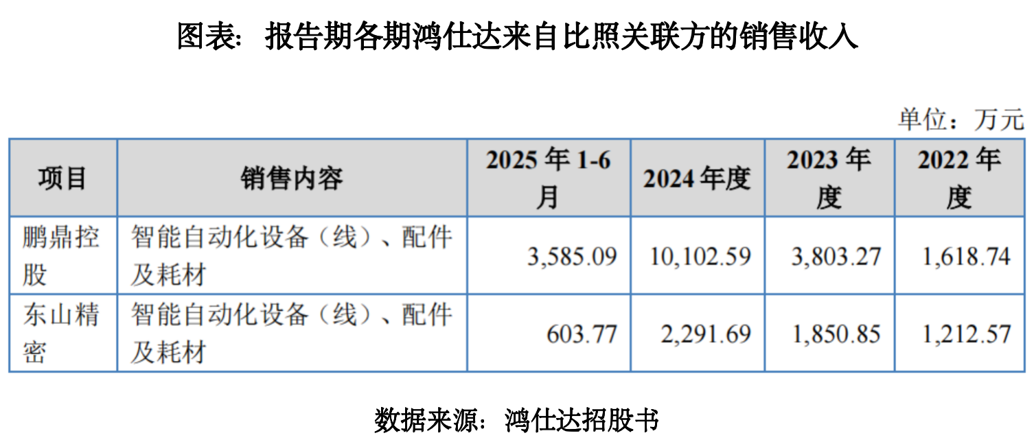 第一轮审核问询函回复文件显示,2022—2025年上半年,鸿仕达来自鹏鼎控股的销售收入分别为1618.74万元、3803.27万元、1.01亿元、3585.09万元,2023年、2024年分别同比增长134.95%、165.63%。