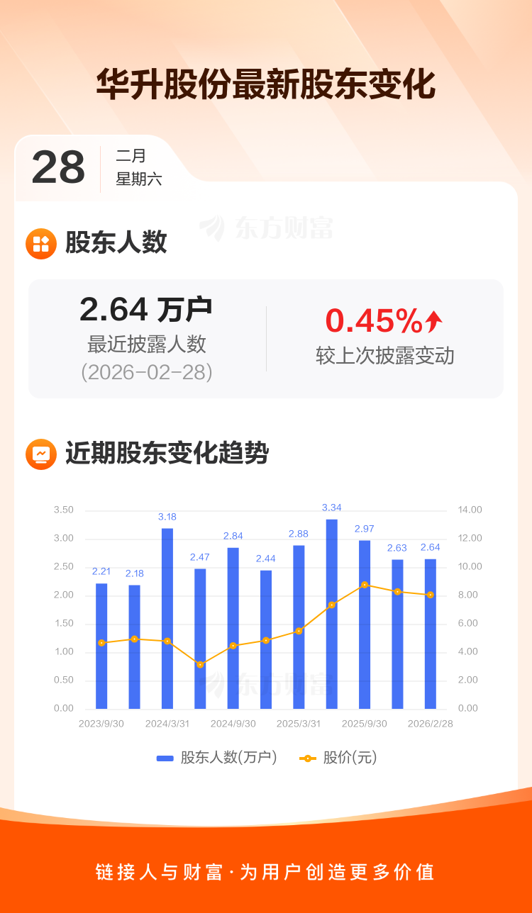 华升股份最新披露数据显示,截至2月28日公司股东户数为2.64万户,较上期(2025年12月31日)增加118户,增幅为0.45%。户均持有流通股数量由上期的1.53万股下降至1.52万股,户均持股金额由上期的12.62万元减少至12.23万元。