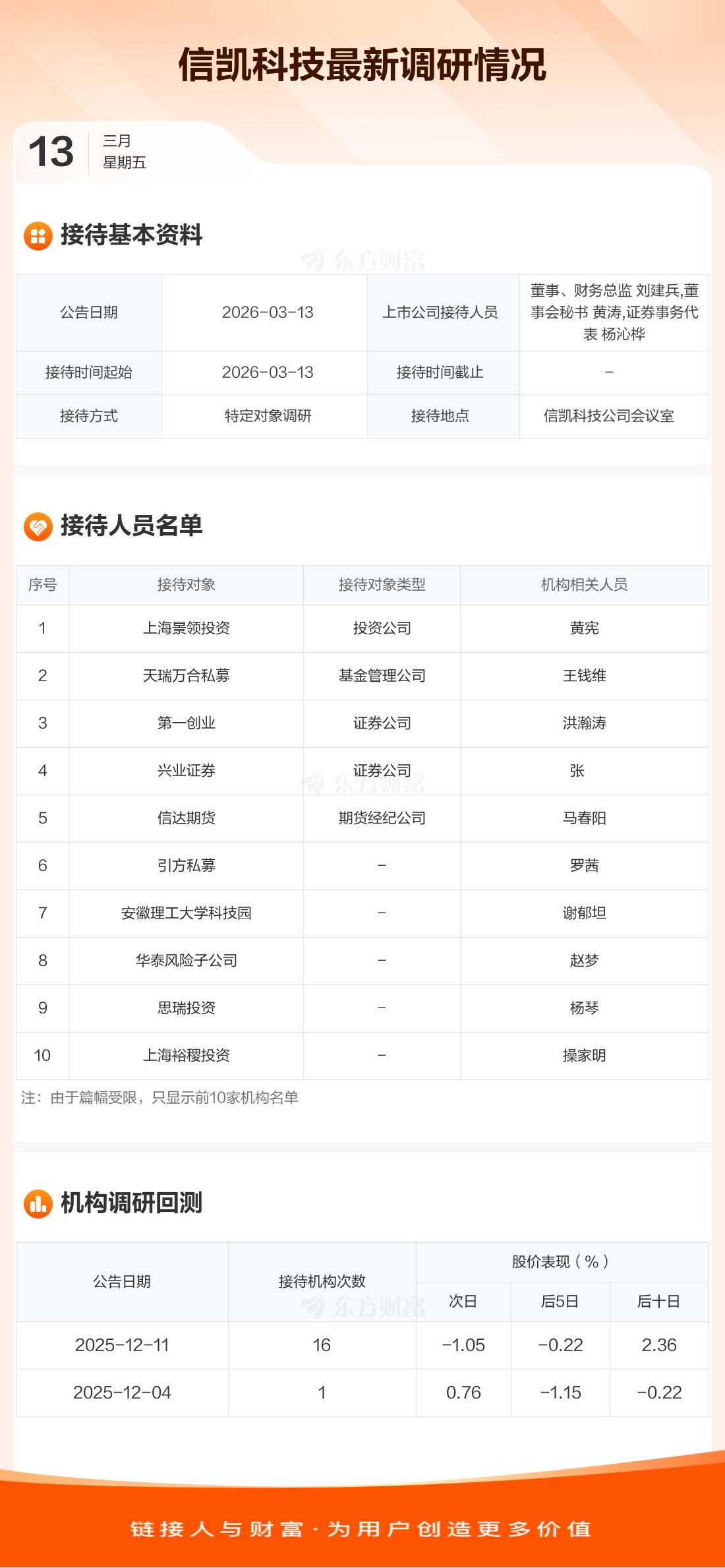 信凯科技3月13日公告称,3月13日接待上海景领投资等16家机构调研。接待人员包括董事、财务总监 刘建兵,董事会秘书 黄涛,证券事务代表 杨沁桦。