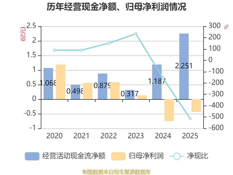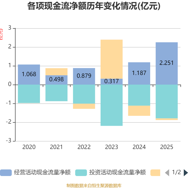 截至2025年,公司经营活动现金流净额为2.25亿元,同比增长89.66%;筹资活动现金流净额-892.53万元,同比增加4499.67万元;投资活动现金流净额-1.8亿元,上年同期为-1.12亿元。