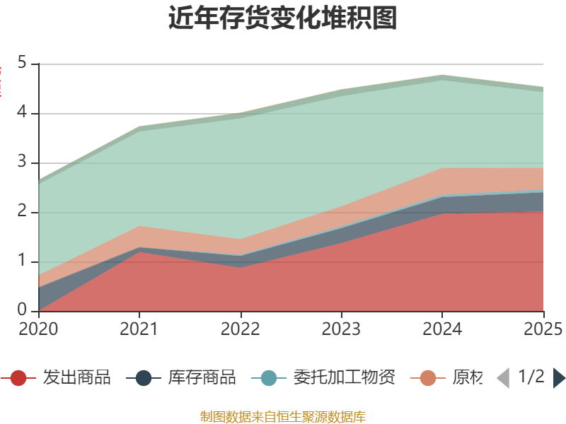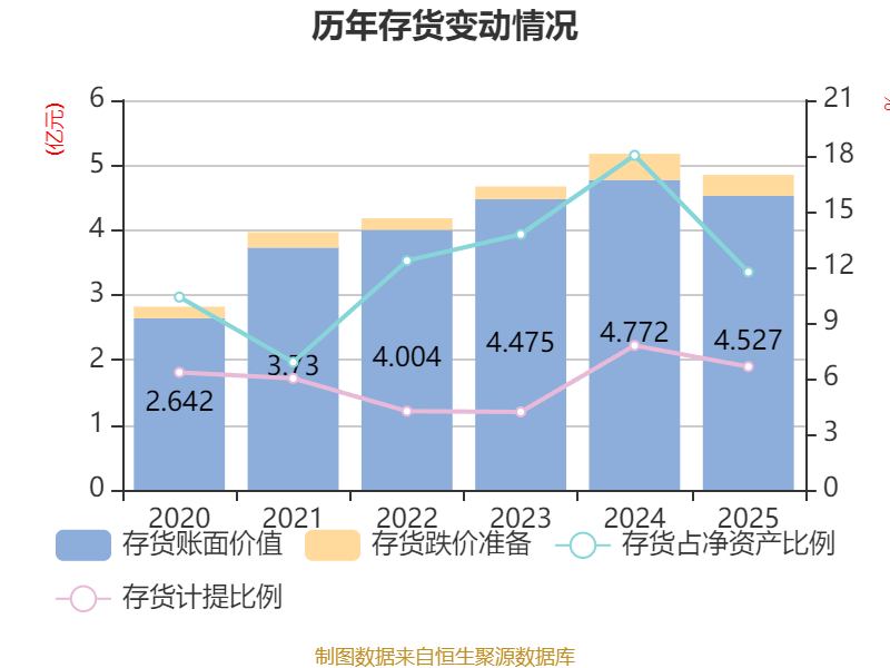 从存货变动来看,截至2025年末,公司存货账面价值为4.53亿元,占净资产的11.74%,较上年末减少2457.25万元。其中,存货跌价准备为3217.9万元,计提比例为6.64%。