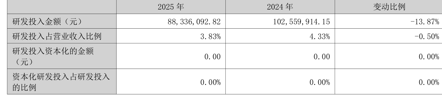 2025年全年,公司研发投入金额为8833.61万元,同比下降13.87%;研发投入占营业收入比例为3.83%,相比上年同期下降0.5个百分点。此外,公司全年研发投入资本化率为0%。
