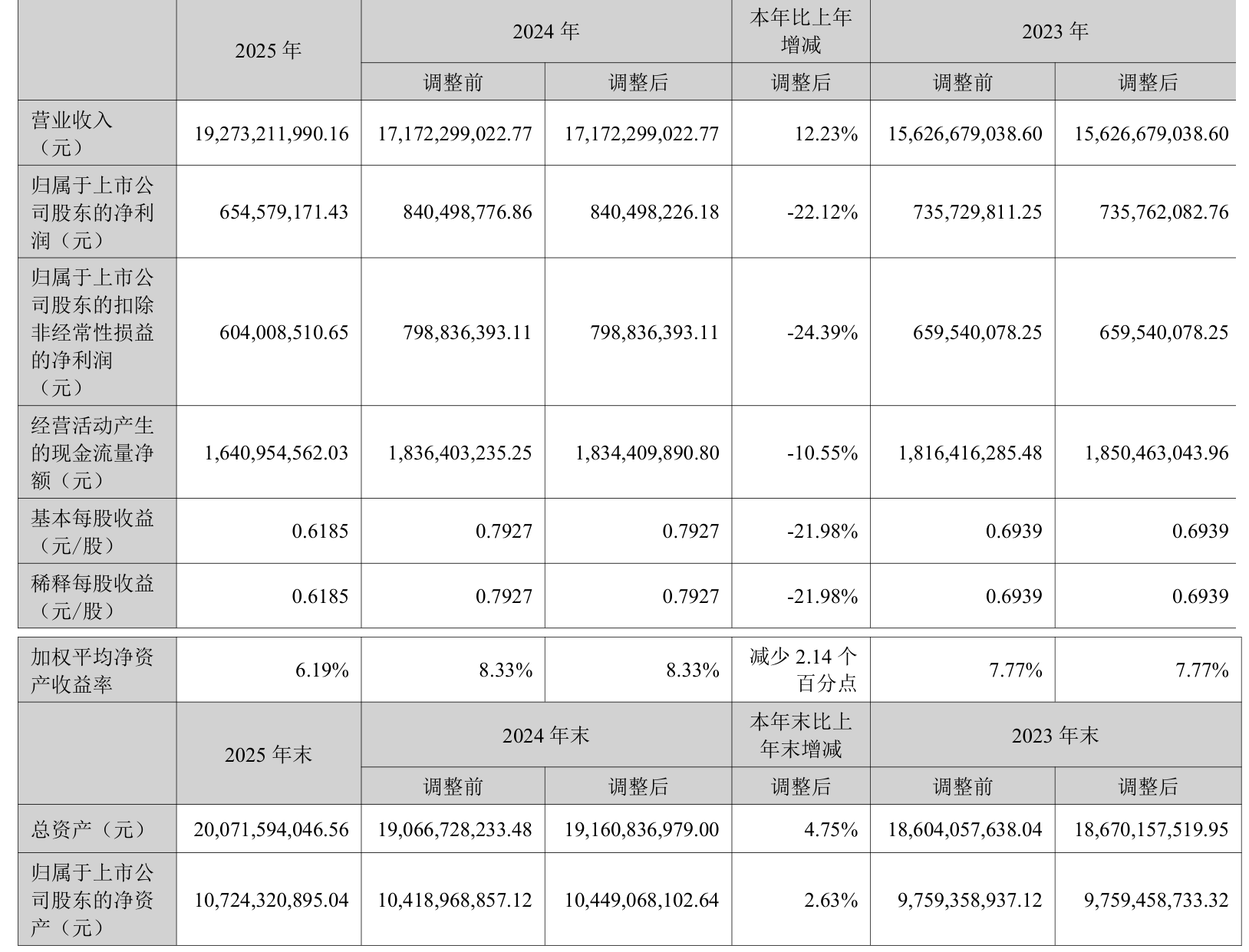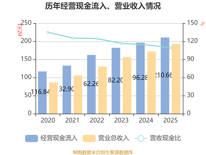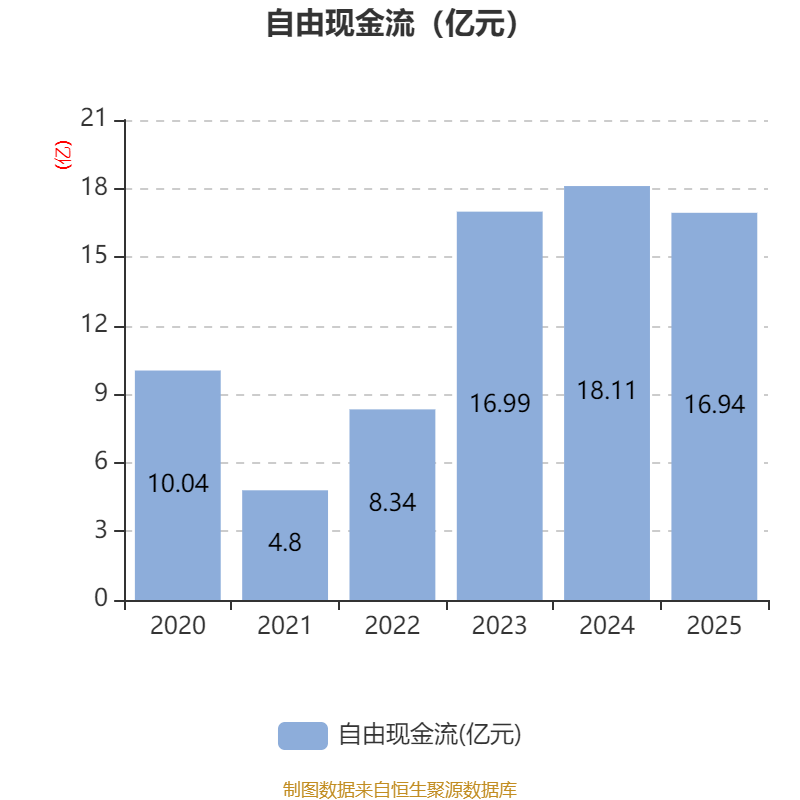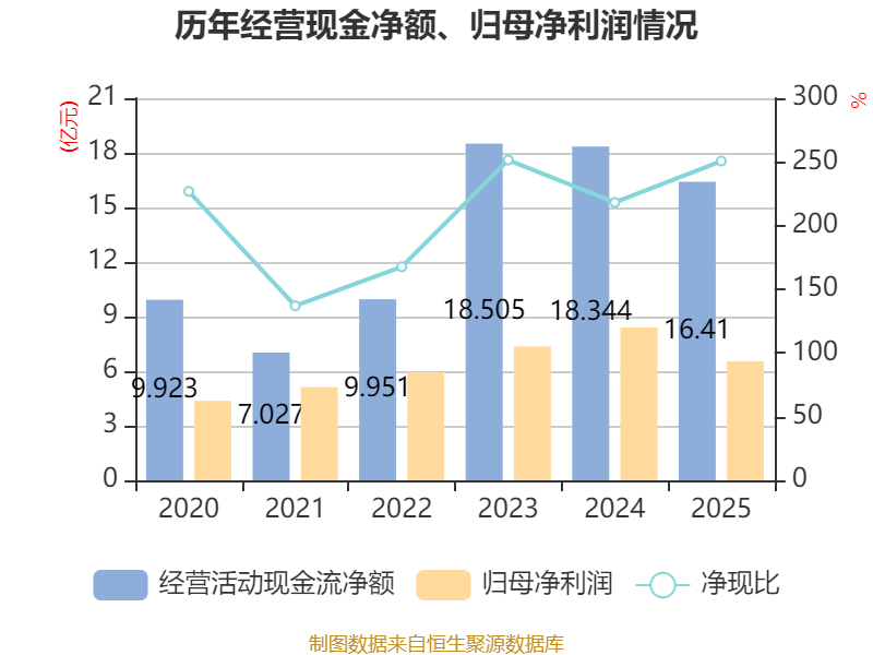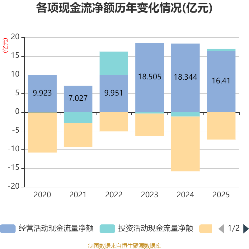 截至2025年,公司经营活动现金流净额为16.41亿元,同比下降10.55%;筹资活动现金流净额-7.37亿元,同比增加7.28亿元;投资活动现金流净额5095.23万元,上年同期为-1.21亿元。