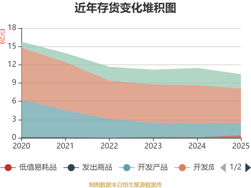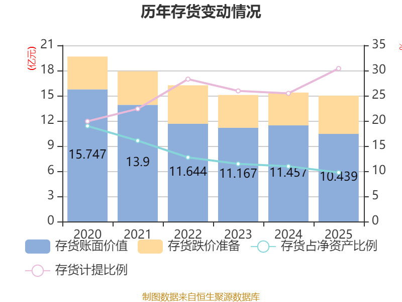 从存货变动来看,截至2025年末,公司存货账面价值为10.44亿元,占净资产的9.73%,较上年末减少1.02亿元。其中,存货跌价准备为4.56亿元,计提比例为30.39%。