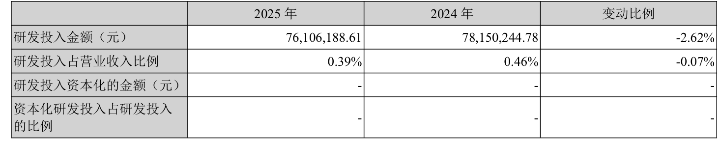 2025年全年,公司研发投入金额为7610.62万元,同比下降2.62%;研发投入占营业收入比例为0.39%,相比上年同期下降0.07个百分点。