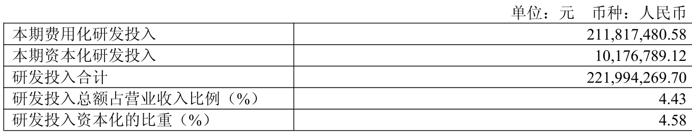 2025年全年,公司研发投入金额为2.22亿元,同比增长12.8%;研发投入占营业收入比例为4.43%,相比上年同期上升0.55个百分点。此外,公司全年研发投入资本化率为4.58%。