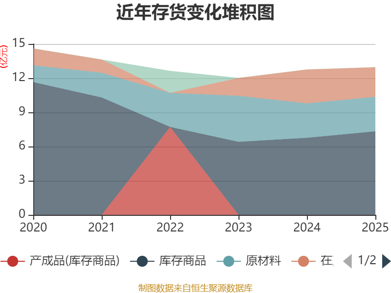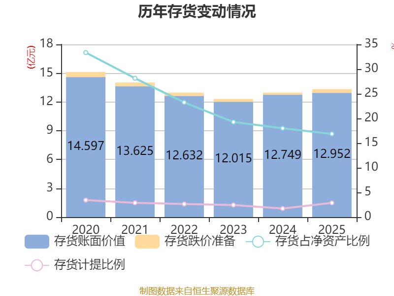 从存货变动来看,截至2025年末,公司存货账面价值为12.95亿元,占净资产的16.86%,较上年末增加2034.81万元。其中,存货跌价准备为3842.13万元,计提比例为2.88%。