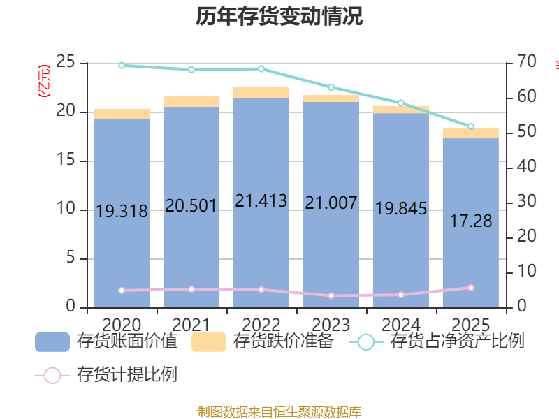 从存货变动来看,截至2025年末,公司存货账面价值为17.28亿元,占净资产的51.79%,较上年末减少2.57亿元。其中,存货跌价准备为1.03亿元,计提比例为5.62%。