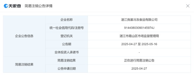 天眼查信息还显示,因食品生产许可证被吊销,且五年内不得申请,“湛江良基冷冻食品有限公司”启动了注销程序,因“化学虾仁”终结了在食品领域的经营可能。