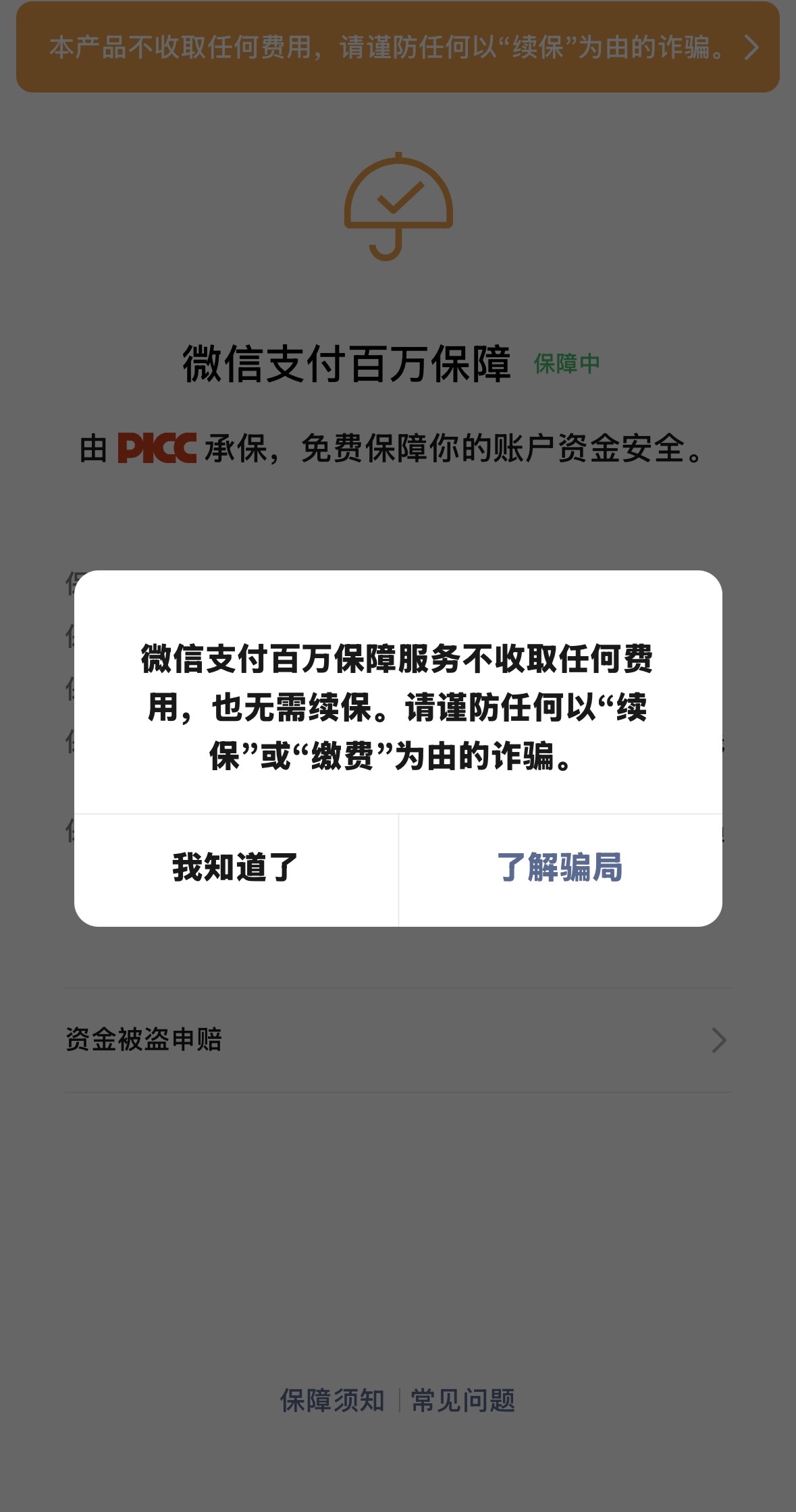 微信官方此前已对这类百万保障骗局进行了提醒。在微信钱包—客服中心—消费者保护—安全保障界面中,点击之后会弹出微信官方提示——“微信支付百万保障服务不收取任何费用,也无需续保,请谨防任何以‘续保’或‘缴费’为由的诈骗。”