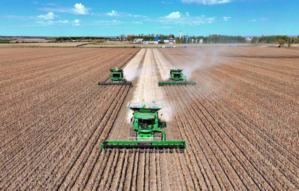 2025年9月29日,在北大荒集团黑龙江尾山农场有限公司第一管理区,农机进行大豆收获作业(无人机照片)。新华社发(陆文祥摄)