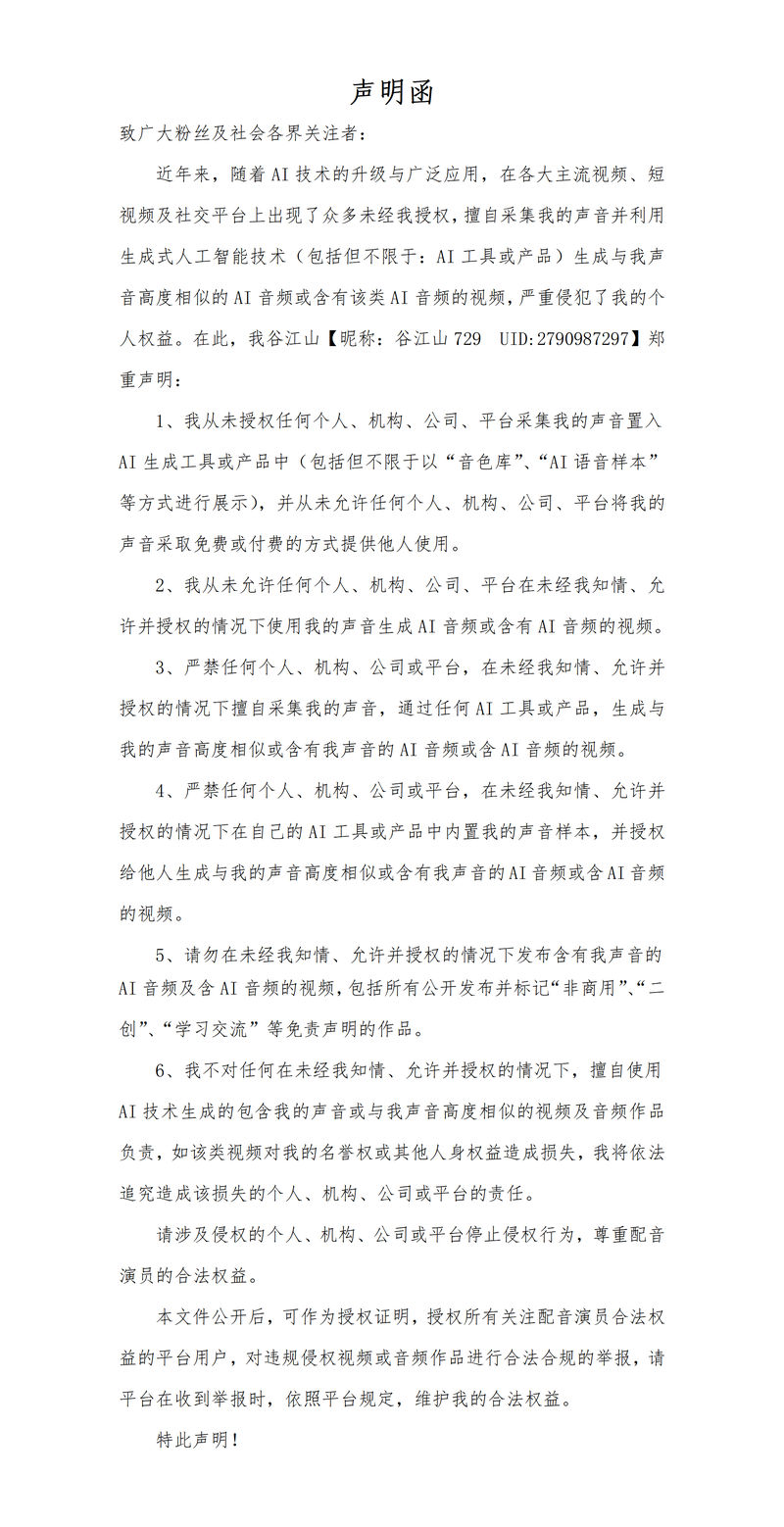 李振武:从法律性质上看,这份由众多配音演员联合发布的声明,是一份针对不特定多数人的、公开的“权利警告函”。其核心功能是公开宣告其对其声音享有法定的声音权益,同时也预先告知社会公众,特别是AI技术开发者、平台及用户,任何未经许可的特定使用行为均被权利人所禁止,这为后续可能的法律行动(如发送侵权通知、提起诉讼)奠定了事实和证据基础。