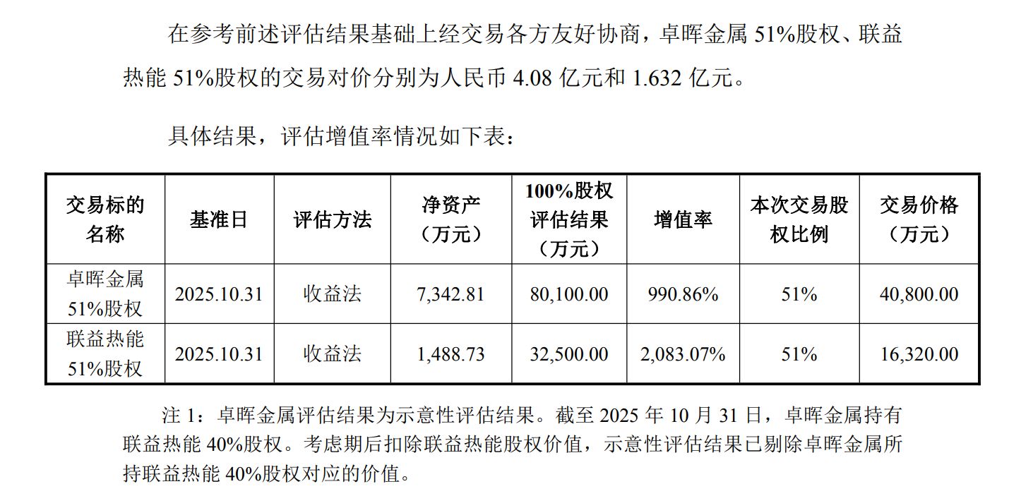 此外,本次交易的评估增值率也值得关注。根据公告,以2025年10月31日为评估基准日,采用收益法评估后,卓晖金属和联益热能的股东全部权益价值分别为8.01亿元和3.25亿元。相较于两家公司彼时的账面净资产,增值率分别高达990.86%和2083.07%。