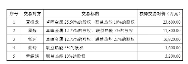 需要说明的是,对于两家收购标的,金富科技的交易对手并不完全相同。其中,收购卓晖金属事项的交易对手分别是莫振龙、周超及杨珂,收购联益热能事项的交易对手则分别是杨珂、莫振龙、尹绍娟、周超及蔡玲。
