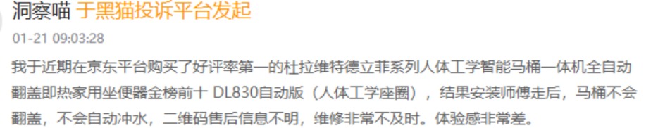 “买的人体工学智能马桶不会翻盖,不会自动冲水,二维码售后信息不明,维修非常不及时,体验感非常差。”消费者张先生表示。