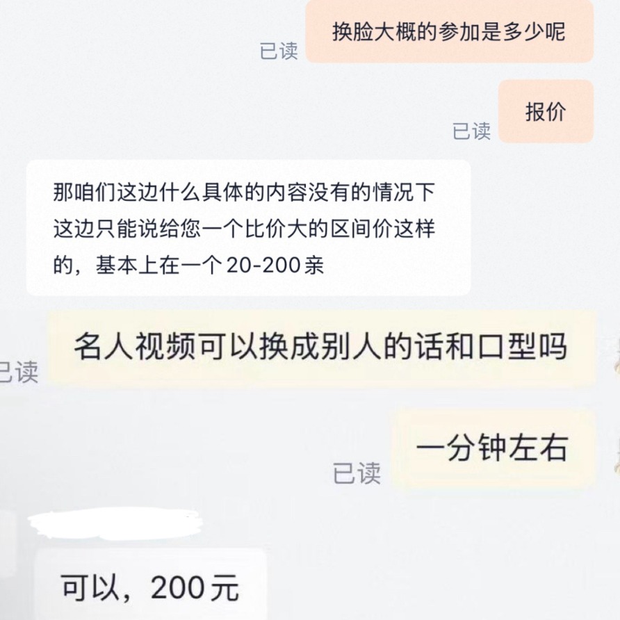 有商家粗略报价,制作换脸视频的价格在20元至200元不等。也有商家要求看完视频内容和需求进行报价,记者发送了一份2分钟的视频,询问能否换脸一位明星,在简单询问是否商用后,这位商家称500元即可制作,对于价格他解释称,由于政策限制,现在行业里真人换脸的难度较大。