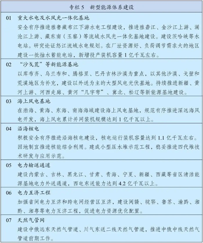 在加力建设新型能源基础设施板块,“十五五”规划纲要要求,深入实施能源安全新战略,加快构建清洁低碳安全高效的新型能源体系,建设能源强国。