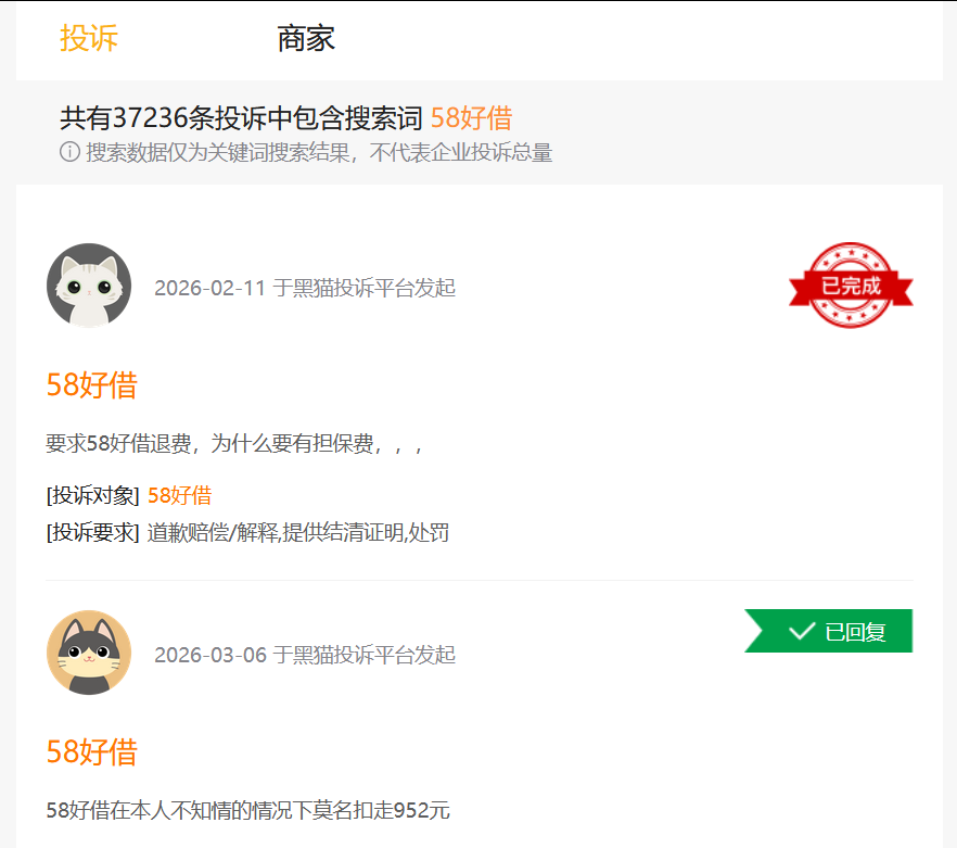 有网友投诉:“本人是58好借平台借款用户,借款共5次分6期还款,现已正常还款结清。 经核查,本人发现该笔借款存在严重的收费乱象: 1.在58好借APP内,每期还款被拆分为本金+利息+咨询服务费+担保服务费该服务费由第三方收取,平台未履行告知义务。其次每笔借款前已经支付平台推出的会员优惠服务费用,这里属于多次违规违法乱收费现象。”