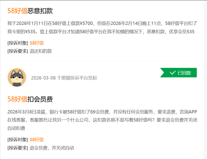 有网友投诉:“我于2026年1月11日在58好借上借款5700元,但是在2026年2月14日晚上11点,58好借平台扣了我卡里的535元。登上借款平台才知道58好借平台在我不知情的情况下,恶意扣款优享会员费535元。”