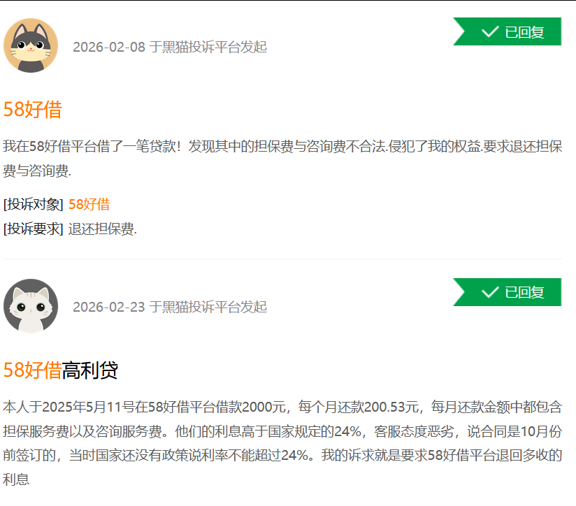 有网友投诉:“我在58好借平台借了两笔款,一笔20000元,一笔23000元。都分成12期还。每月的还款,除了本金和利息外还有一个担保服务费。两笔借款每期的担保服务费共374.1元,12期共计4489.2元。我觉得这个费用属于不合理收费。我打电话问58好借的客服,客服说他们具备担保资格,这个费用是没法退的。所以在这里对58好借平台收取不合理的担保服务费进行投诉,希望58好借平台尽快退还这份不合理收费。”