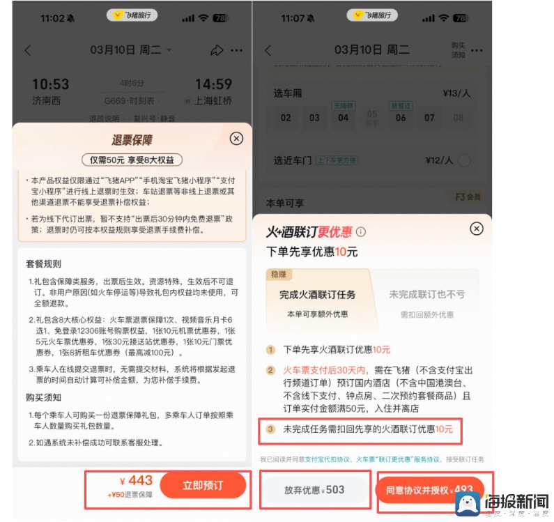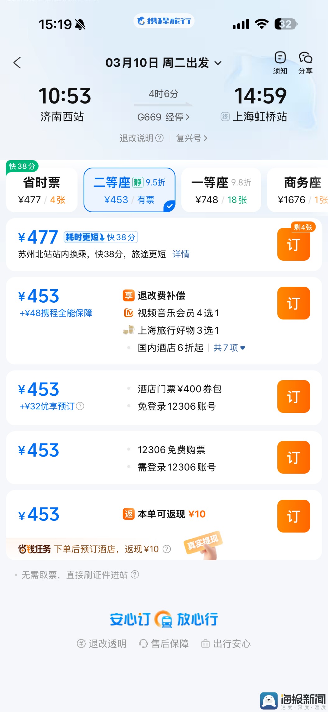 日前,海报新闻记者模拟真实消费者购票流程,以3月10日济南西至上海虹桥(G669次)高铁二等座为统一测试标的,对携程、去哪儿网、飞猪、同程旅行、途牛旅行、智行火车票6大网络订票平台开展了全流程购票测试。