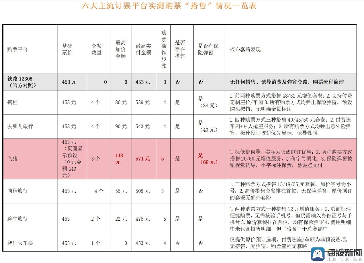 本次测试中,车次基础票价为453元(12306显示9.5折)。仅智行火车票无搭售套路,其余5家平台均存在不同程度的隐形加价、页面诱导、保险弹窗等问题,平台通过隐蔽、复杂的“价格排序陷阱”和“视觉误导”,引诱消费者多付费。飞猪平台最高实付金额571元,较基础票价高出118元,购票操作步骤繁琐,在购票的各个环节“套路”层出,是本次购票实验中“套路”最多,价格最高的平台。