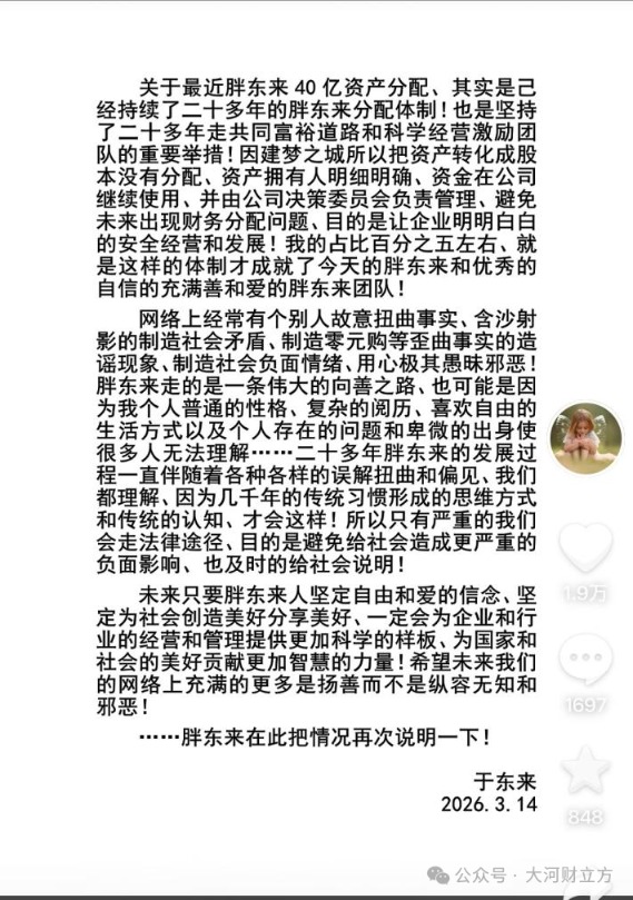 【大河财立方记者司高妍】3月14日,胖东来创始人于东来在社交平台再次发文,对胖东来40亿元资产分配再做说明。
