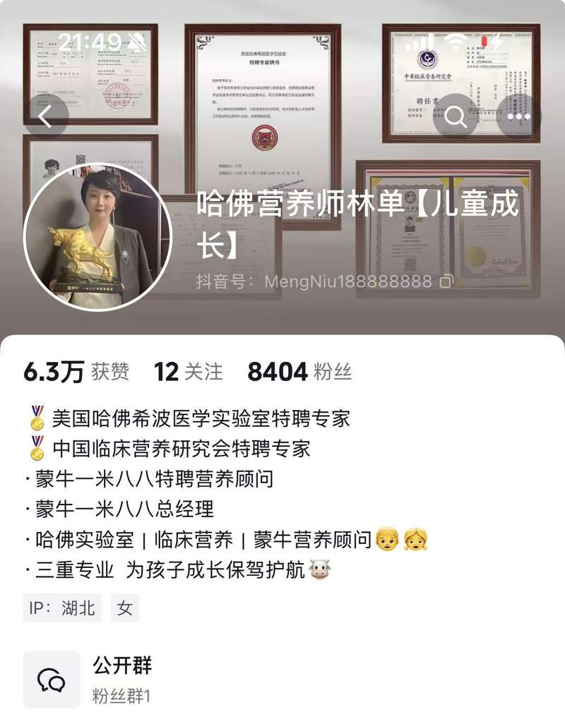 此外,在视频平台上,一名推广一米八八奶粉的主播,自称是蒙牛一米八八总经理,其个人介绍包括“哈佛营养师林单”、美国哈佛希波医学实验室特聘专家、中国临床营养研究会特聘专家等头衔。账号背景主页是用中文写就的美国哈佛希波医学实验室特聘专家聘书等名头。