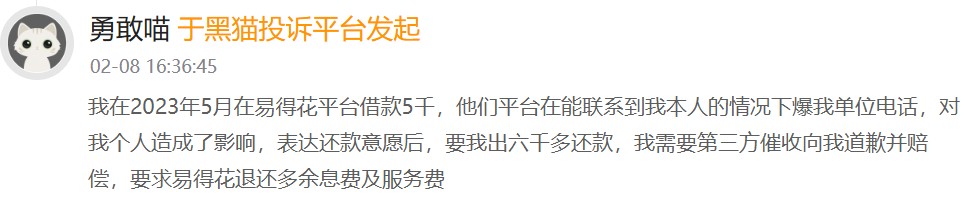 有用户表示,其在2023年5月在易得花平台借款5000元,平台在能联系到其本人的情况下爆其单位电话,对其个人造成了影响,表达还款意愿后,要其出六千多还款,需要第三方催收向其道歉并赔偿,要求易得花退还多余息费及服务费。