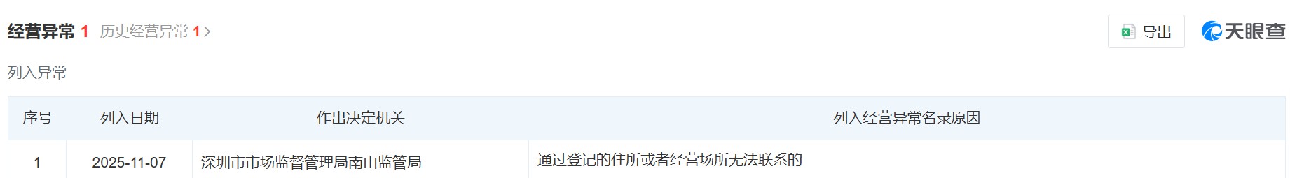 值得注意的是,2025年11月,兴弦网络因通过登记住所或经营场所无法联系,被深圳市市场监督管理局南山监管局列入经营异常名录,至今未移除。