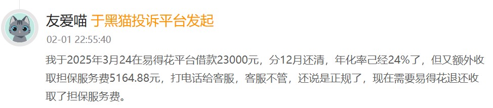 有消费者表示,其于2025年3月24在易得花平台借款23000元,分12月还清,年化率已经24%了,但又额外收取担保服务费5164.88元,打电话给客服,客服不管,现在需要易得花退还担保服务费。