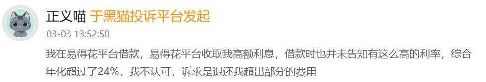 有消费者表示,其在易得花平台借款,易得花平台收取高额利息,借款时也并未告知有这么高的利率,综合年化超过了24%,不认可,诉求是退还超出部分的费用。