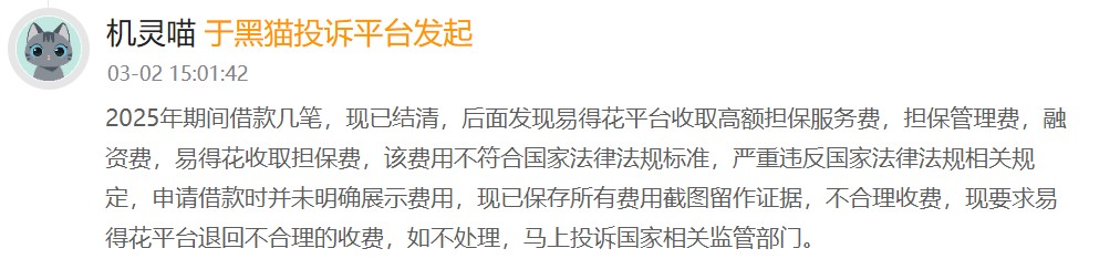 有消费者表示,2025年期间借款几笔,现已结清,后面发现易得花平台收取高额担保服务费,担保管理费,融资费,易得花收取担保费,该费用不符合国家法律法规标准,严重违反国家法律法规相关规定,申请借款时并未明确展示费用,现已保存所有费用截图留作证据,不合理收费,现要求易得花平台退回不合理的收费,如不处理,马上投诉国家相关监管部门。