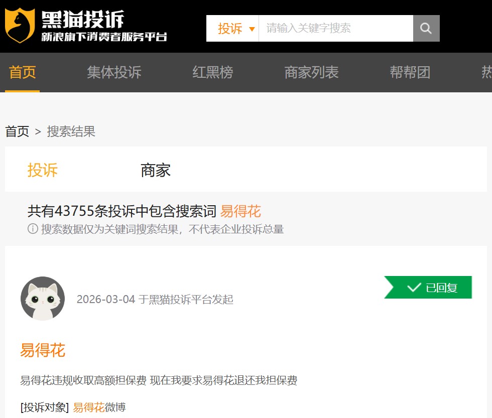 深圳商报读创客户端记者查询黑猫投诉平台发现,易得花平台共有43755条投诉中包含搜索词易得花。
