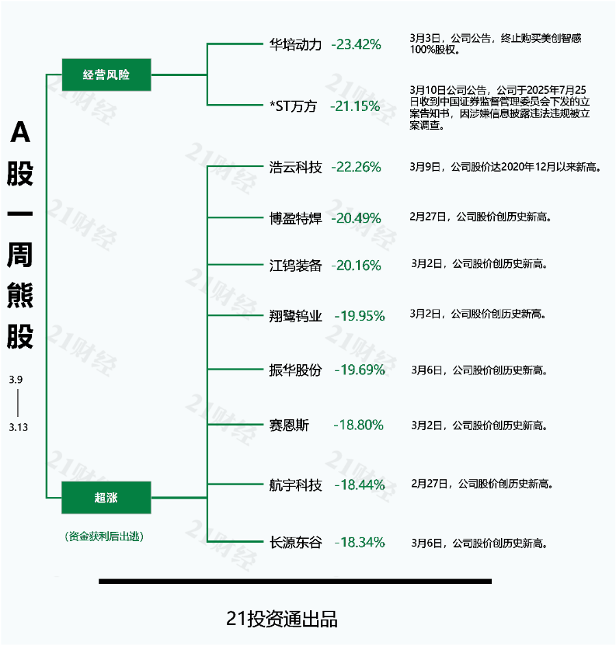 本期十大熊股中,华培动力(603121.SH)以23.42%的跌幅成为本期的最熊股。浩云科技(300448.SZ)、*ST万方(000638.SZ)、博盈特焊(301468.SZ)、江钨装备(600397.SH)等股的周跌幅均在18%以上。