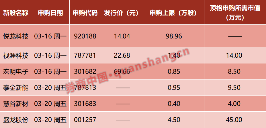 本周(3月16日—3月20日)有6只新股发行,周一:悦龙科技、视涯科技、宏明电子;周五:泰金新能、慧谷新材、盛龙股份。