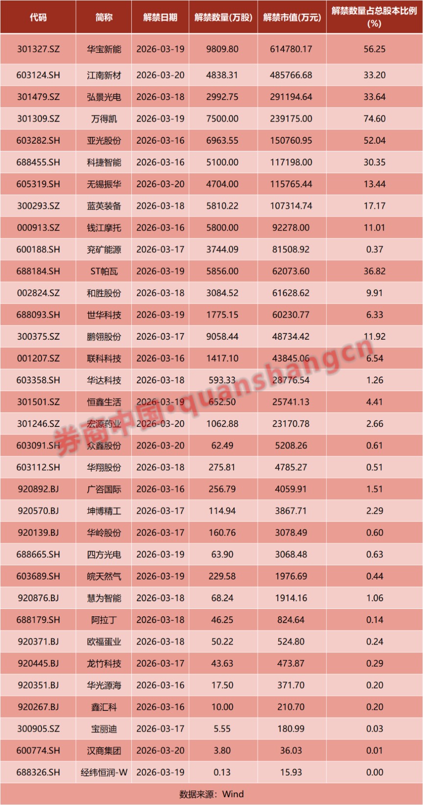 从解禁占比来看,居前三位的是:万得凯(74.6%)、华宝新能(56.25%)、亚光股份(52.04%)。