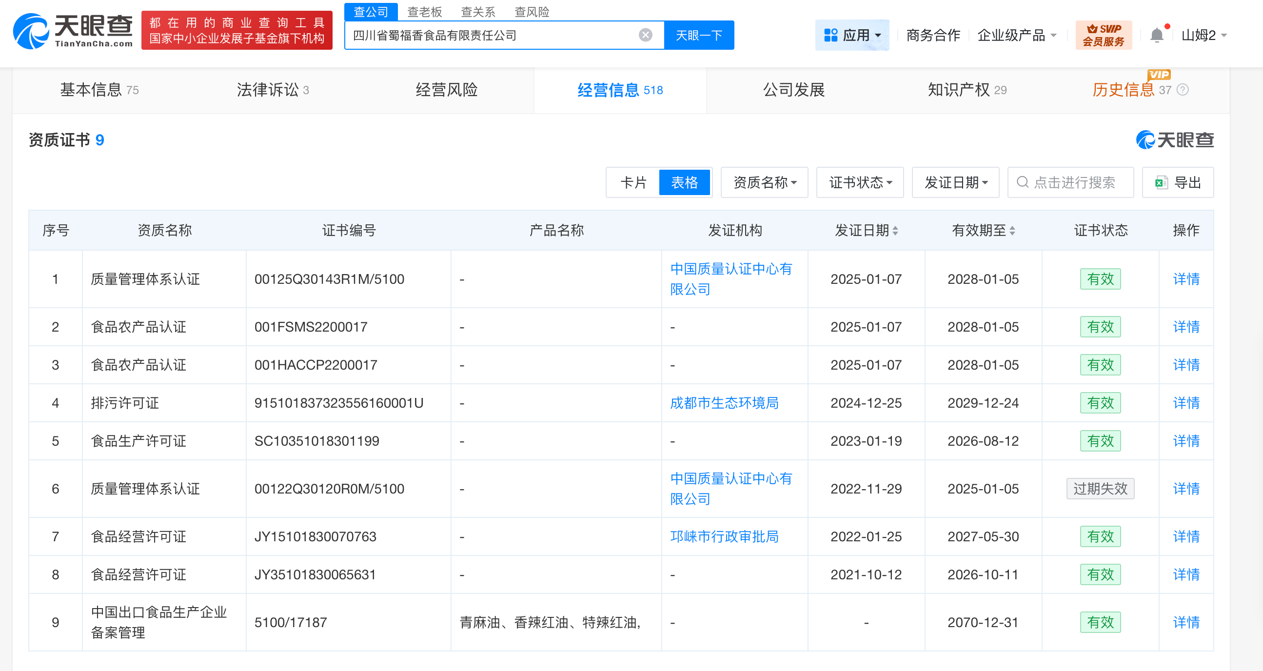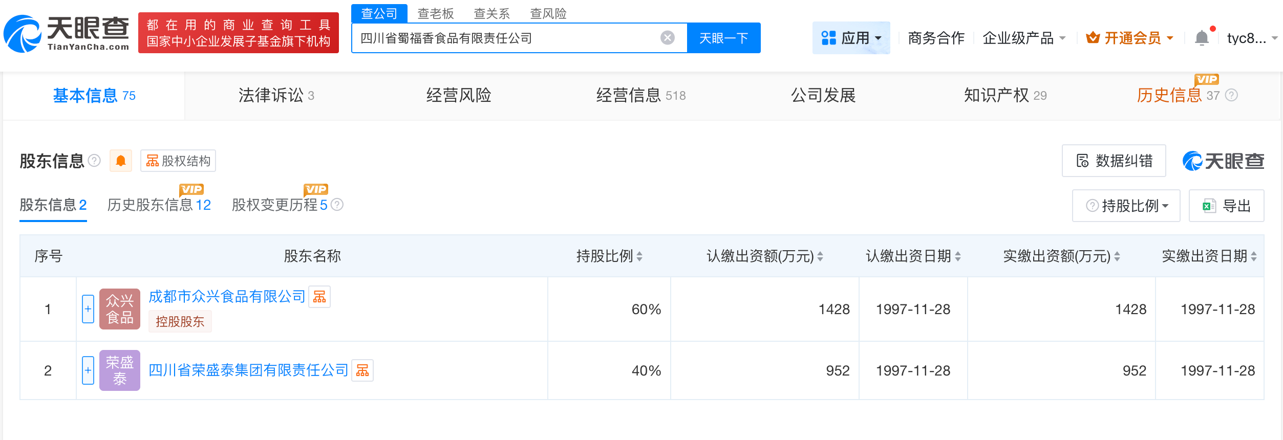 天眼查App显示,四川省蜀福香食品有限责任公司成立于1997年12月,法定代表人为王立群,注册资本2380万人民币,经营范围包括食品生产、食品销售、餐饮服务等,由成都市众兴食品有限公司、四川省荣盛泰集团有限责任公司共同持股。经营信息显示,已获得质量管理体系认证。