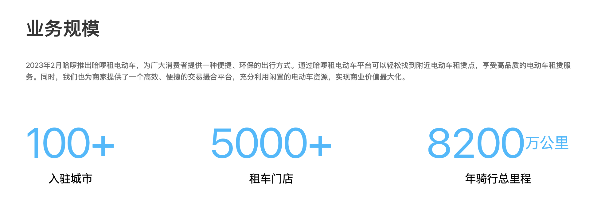 2023年2月,哈啰推出哈啰租电动车,为广大消费者提供一种便捷、环保的出行方式。公司称,“通过哈啰租电动车平台可以轻松找到附近电动车租赁点,享受高品质的电动车租赁服务。同时,我们也为商家提供了一个高效、便捷的交易撮合平台,充分利用闲置的电动车资源,实现商业价值最大化。”