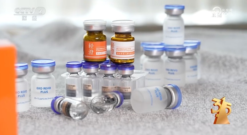 根据消费者提供的信息,“3·15”晚会记者在市场上找到了一款“外泌体”产品“轻澄”。其生产商灏麟(天津)生物科技有限公司的工作人员称,他家生产的这款产品,主要成分就是“外泌体”,但为了躲避市场监管,他们“套”用了胶原蛋白的许可证。套证生产、违规添加、违规销售,但这并不是“外泌体”乱象的全貌。市场还有些公司存在着虚假宣传的行为,他们对自家生产的“外泌体”产品,不仅宣传可以美容抗衰,甚至还夸张到可以治疗多种疾病。