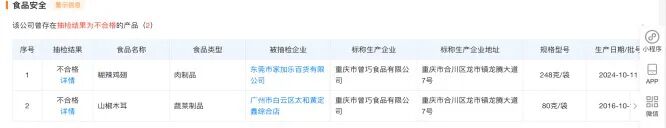 天眼查显示,曾巧食品的糊辣鸡翅、山椒木耳两款产品曾被抽检不合格,前者为菌落总数超标,后者则是添加了不允许添加的乙二胺四乙酸二钠。
